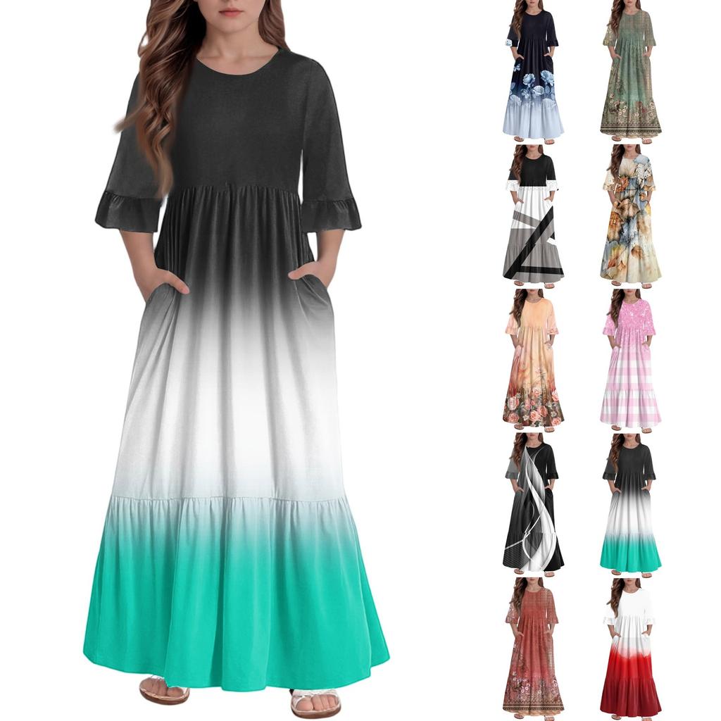 Girls' Tiered Ruffle Dress - 3/4 Sleeve Pocket Maxi With Pockets