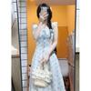 Gentle wind waist and thin doll collar floral dress with blue shawl cardigan two-piece suit for women