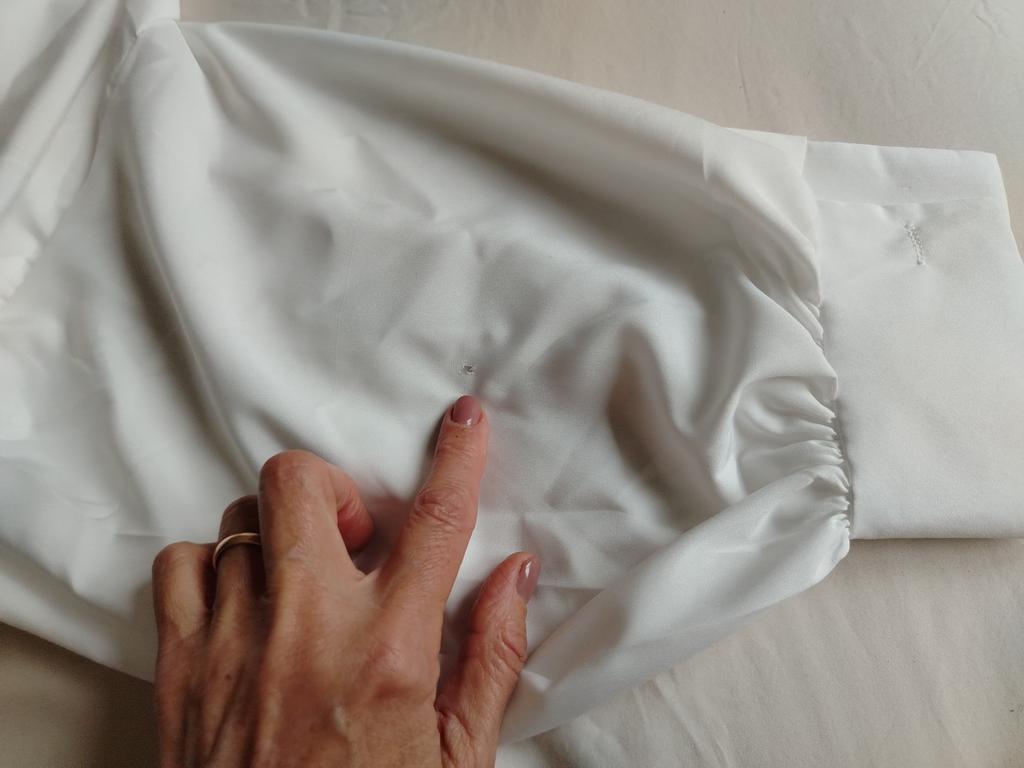 Hole in the sleeve, collar sewn poorly, threads sticking out