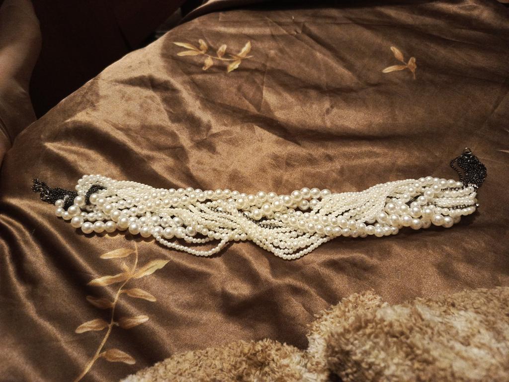Llegó todo entero, el collar es aparatoso para mí personalmente. Lo voy a "partir por la mitad". El collar consta de cuentas más grandes, cuentas más pequeñas, cadenas, cinta de pedrería. Cierre de mosquetón.