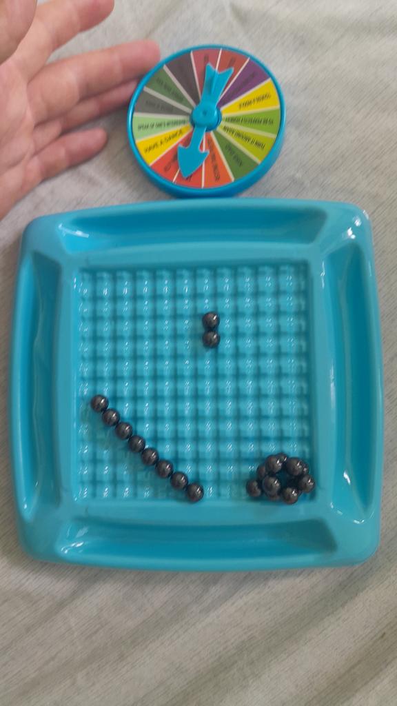 Som på bildet. Plastplate og 21 magnetiske kuler.