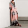 Løft stilen din med vår elegante sommerkjolekolleksjon, med nydelige design som fremhever kurvene dine og skaper en slankere silhuett.. Vår trykte lange kjole har en stående krage og en ren, elegant stil som er perfekt for enhver anledning. Den dype V-halsen og klokkeermene tilfører et sofistikert preg, mens det elegante blomstermønsteret utstråler en feminin sjarm.