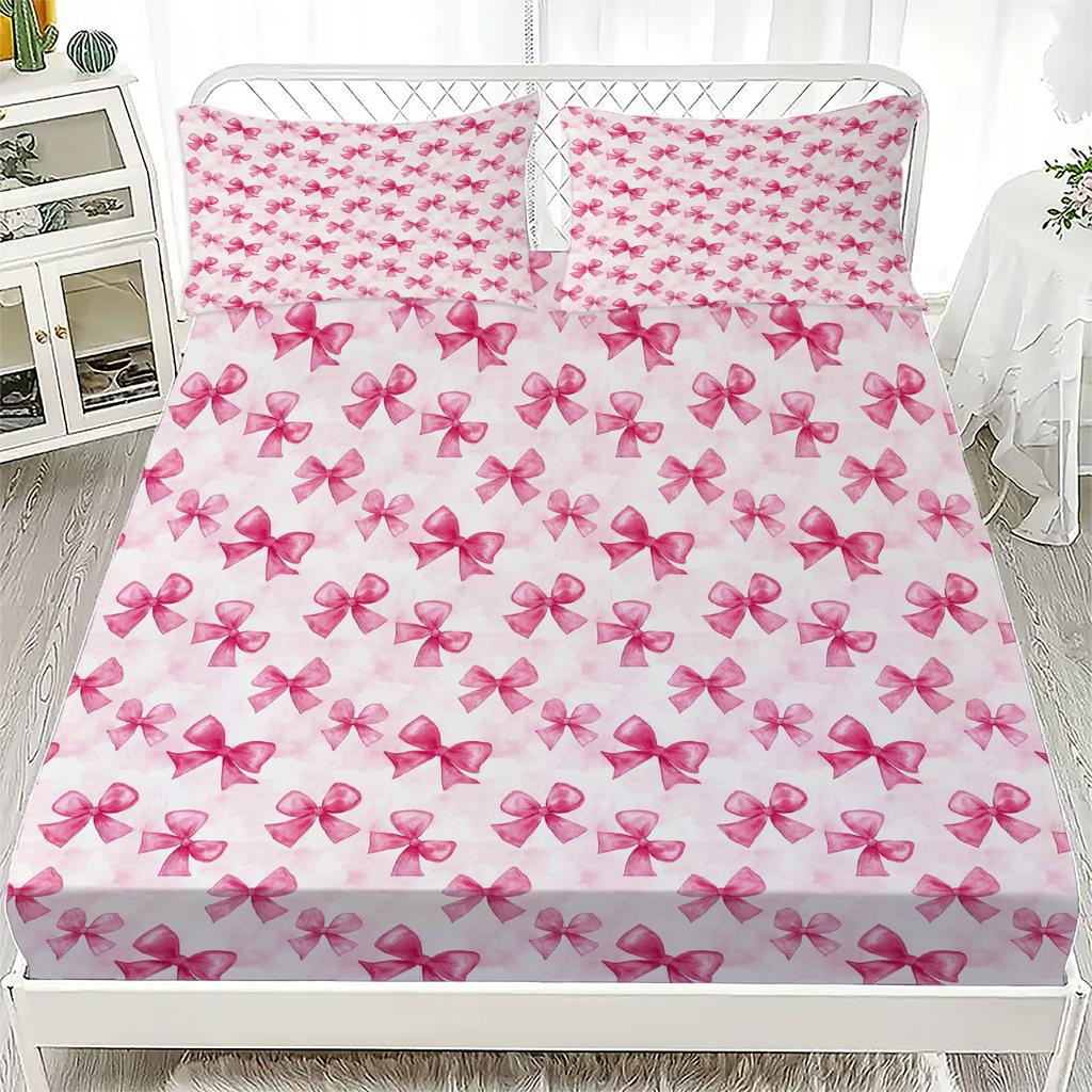 Pink Bowknot Fitted Sheet Bedding Set Adorable Style Skin-Friendly 3D Customized Bedding Set Suitable for Female Bedrooms